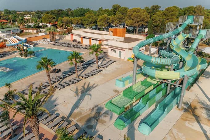 Camping Yelloh! Village L'Oasis et California (Le Barcarès, Pireneje Wschodnie). Kemping posiada wyznaczone, z cieniem, bez cienia i stanowiska z cieniem. Istnieje możliwość wynajęcia przyczep stacjonarnych i domków turystycznych. Na kempingu znajduje się plac zabaw i teren sportowy.